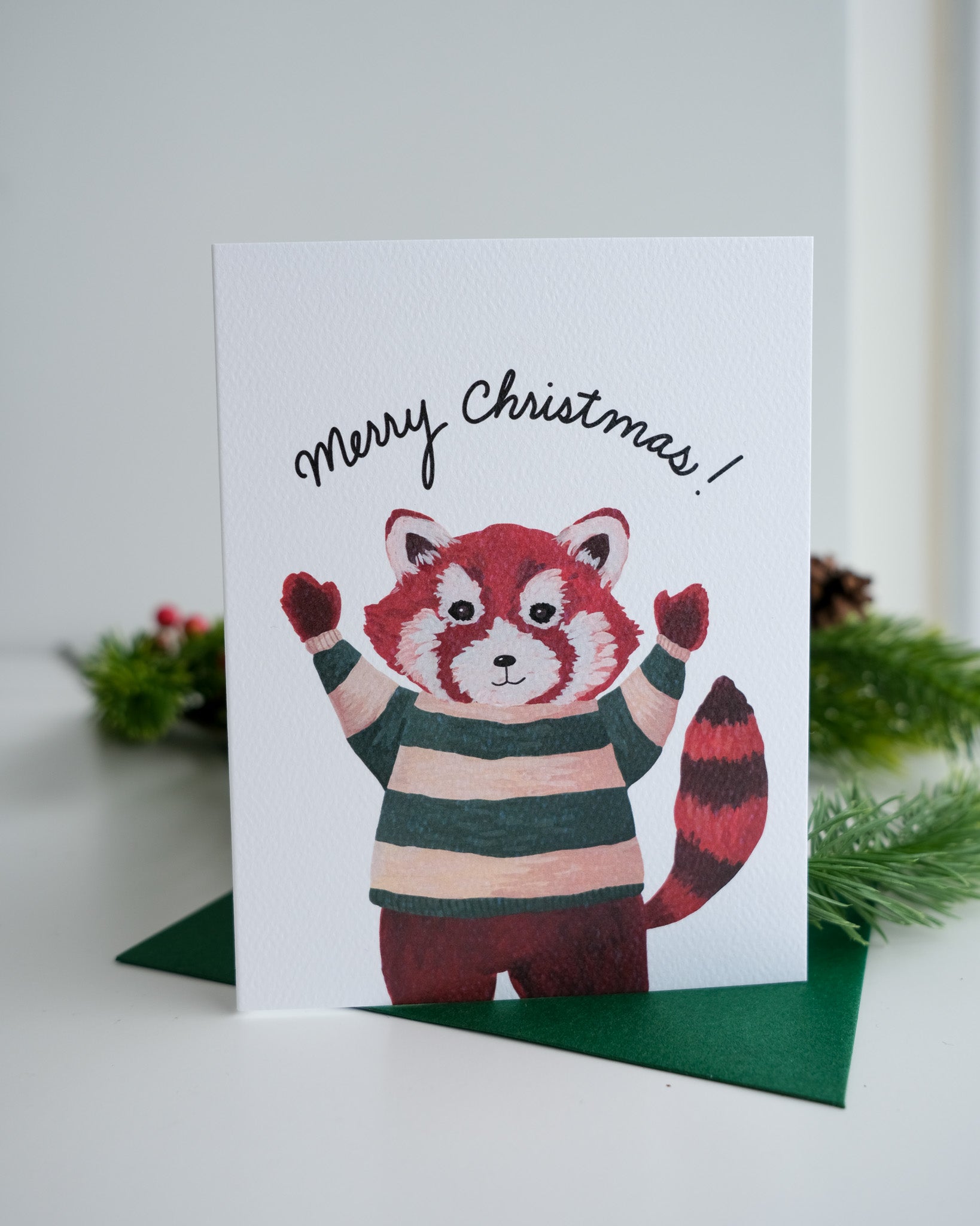 This red panda is ready to celebrate the holidays in a sensible striped green and cream sweater! Purchase this card on its own, or as part of our "Holiday Party Animals" collection.