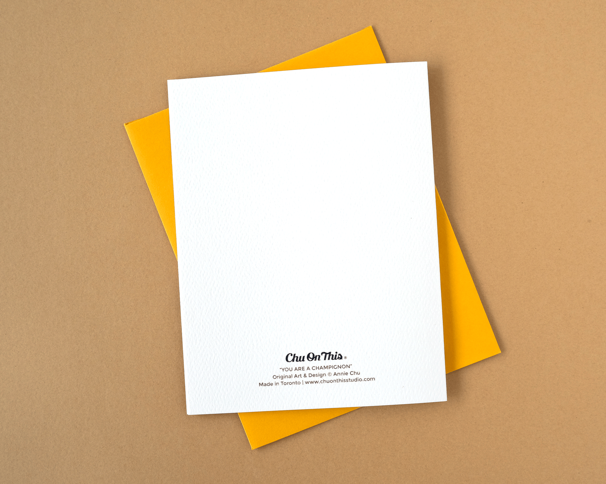 Design features original gouache mushroom illustrations by Annie Chu. Hand-lettering reads “you are a champignon”. Blank inside for your own message.