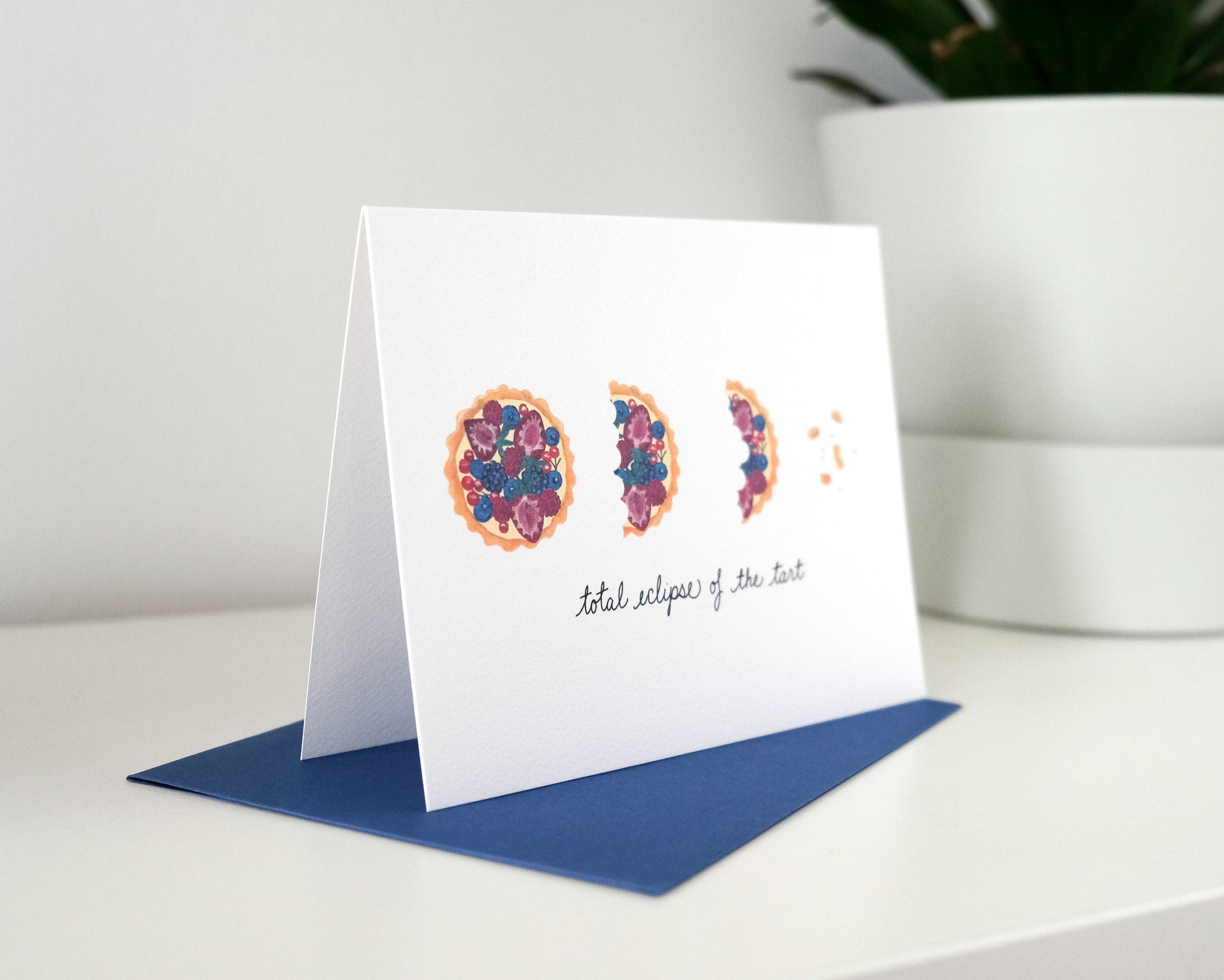 Design features hand-lettering and original acrylic illustrations by Annie Chu. Front lettering reads “total eclipse of the tart”, back lettering reads "turn around...". Blank inside for your own message.