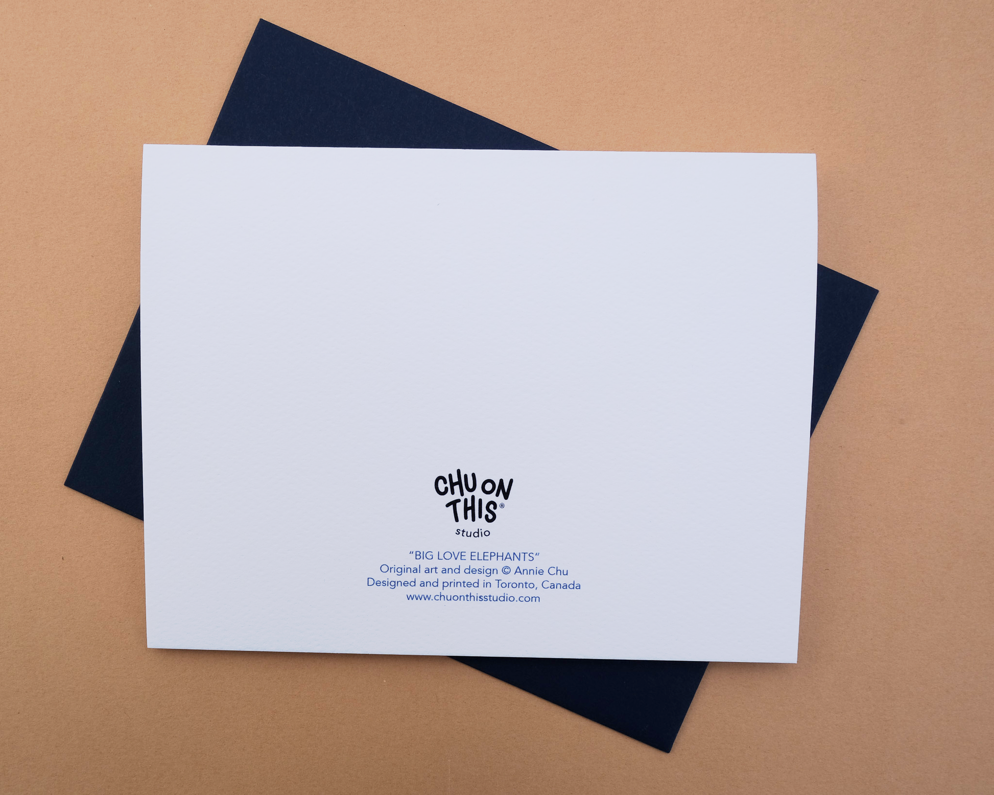 Design features a big and little elephant, hand-illustrated in acrylic gouache by Annie Chu. Hand-lettering reads "big love to you and your little one". Blank inside for your own message.