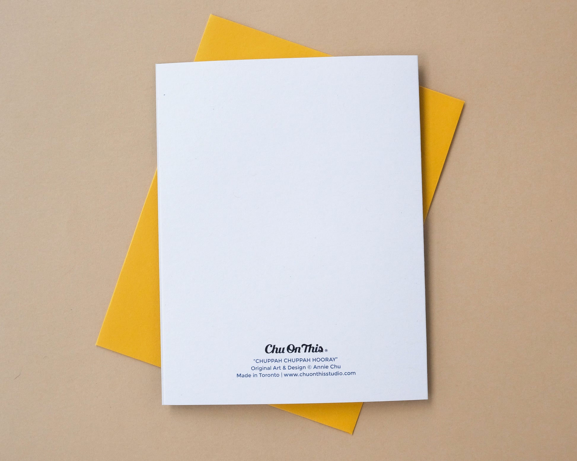 Design features original chuppah gouache illustration by Annie Chu. Hand-lettered text reads "chuppah chuppah hooray!". Blank inside for your own message.